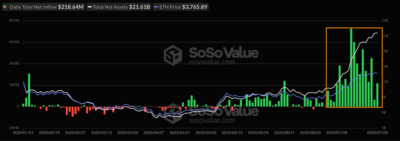 Tuesday’s $218 million net inflow into Spot Ether ETFs marks an 18-day streak of positive inflows, totaling over $5.3 billion since July 2.