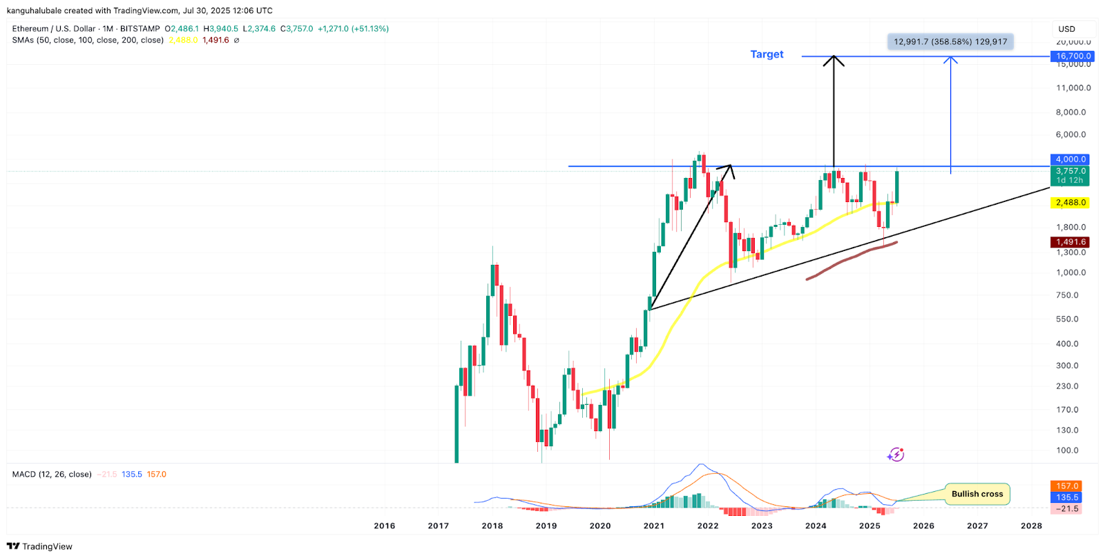 That puts Ether’s breakout target for 2025–2026 at about $16,700, up by more than 350% from current price levels.