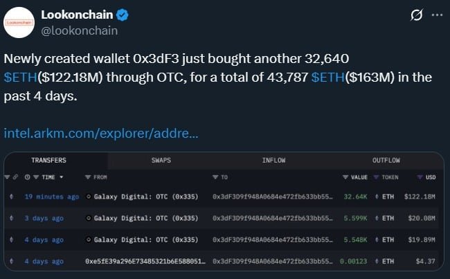 Not just that, another newly created crypto wallet purchased 32,640 ETH worth $122.18 million through OTC deals.