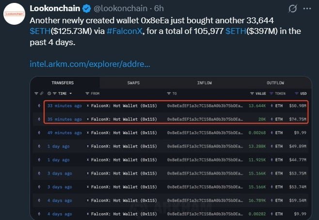 A newly created wallet, 0x8eEa, has accumulated a notable 33,644 ETH worth $125.73 million via FalconX.