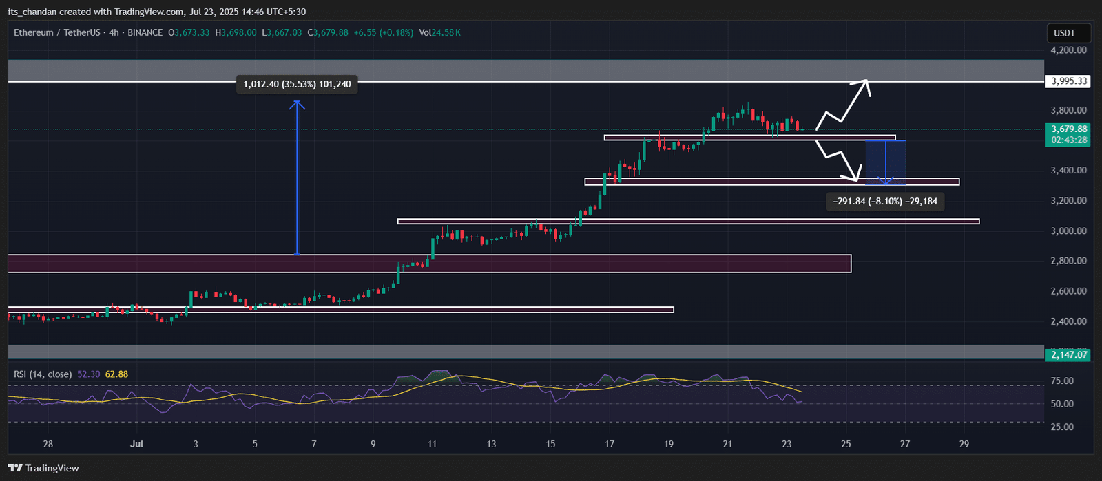 Based on the 4-hour timeframe, ETH has been consistently taking support from the $3,650 level.