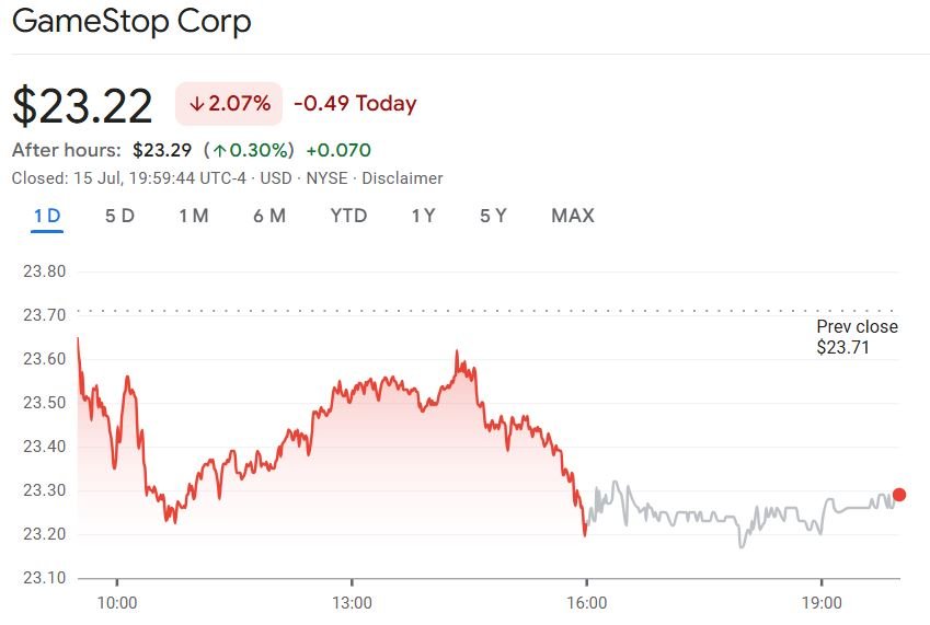 At the close of trading on Tuesday, however, GameStop shares were down over 2% and trading at $23.22, seeing just a 0.30% bump to $23.29 after the bell.