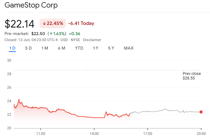 Google Finance data shows that GameStop’s share price fell over 22% on Wednesday after the initial $1.75 billion round was announced.