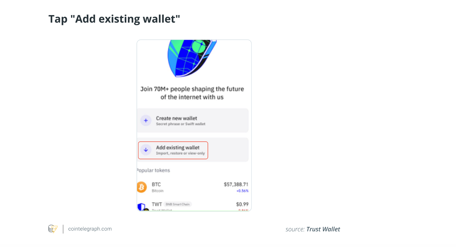 Upon logging in to the wallet application, you will be asked whether you want to “Create a new wallet” or “Add an existing wallet.” Choose to add an existing wallet or restore it.