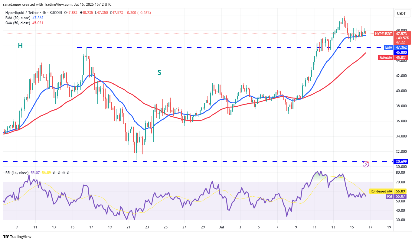 The upsloping moving averages and the relative strength index (RSI) near the overbought territory indicate buyers are in control. If the price rebounds off $45.80, it suggests the bulls have flipped the level into support. That enhances the prospects of a break above $50. The HYPE/USDT pair may then ascend to $60.