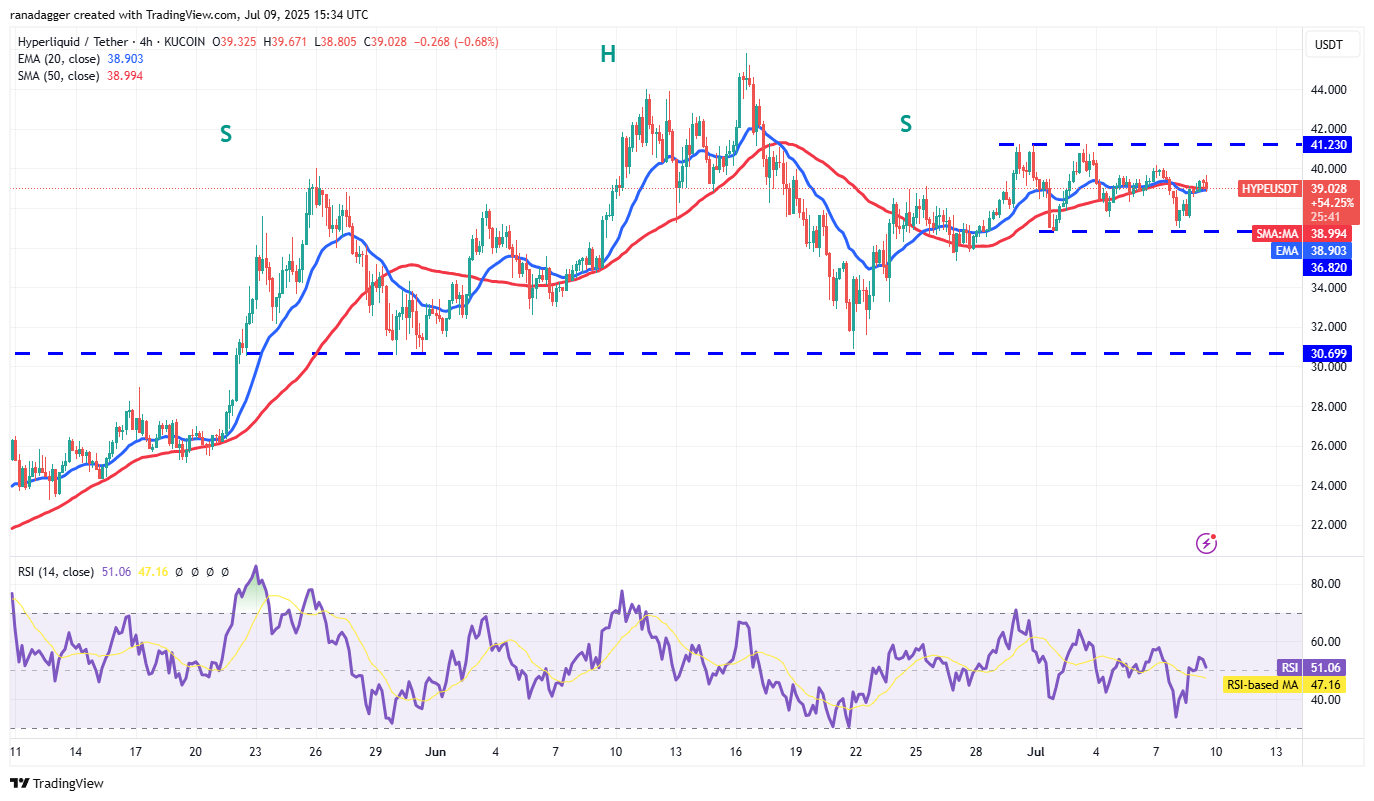 The gradually upsloping 20-day exponential moving average (EMA) ($38.43) and the relative strength index (RSI) just above the midpoint indicate a slight edge to the bulls. The HYPE/USDT pair could rise to $41.23, which is a crucial overhead resistance. If this level is scaled, the pair could surge to $44 and later to $45.80.