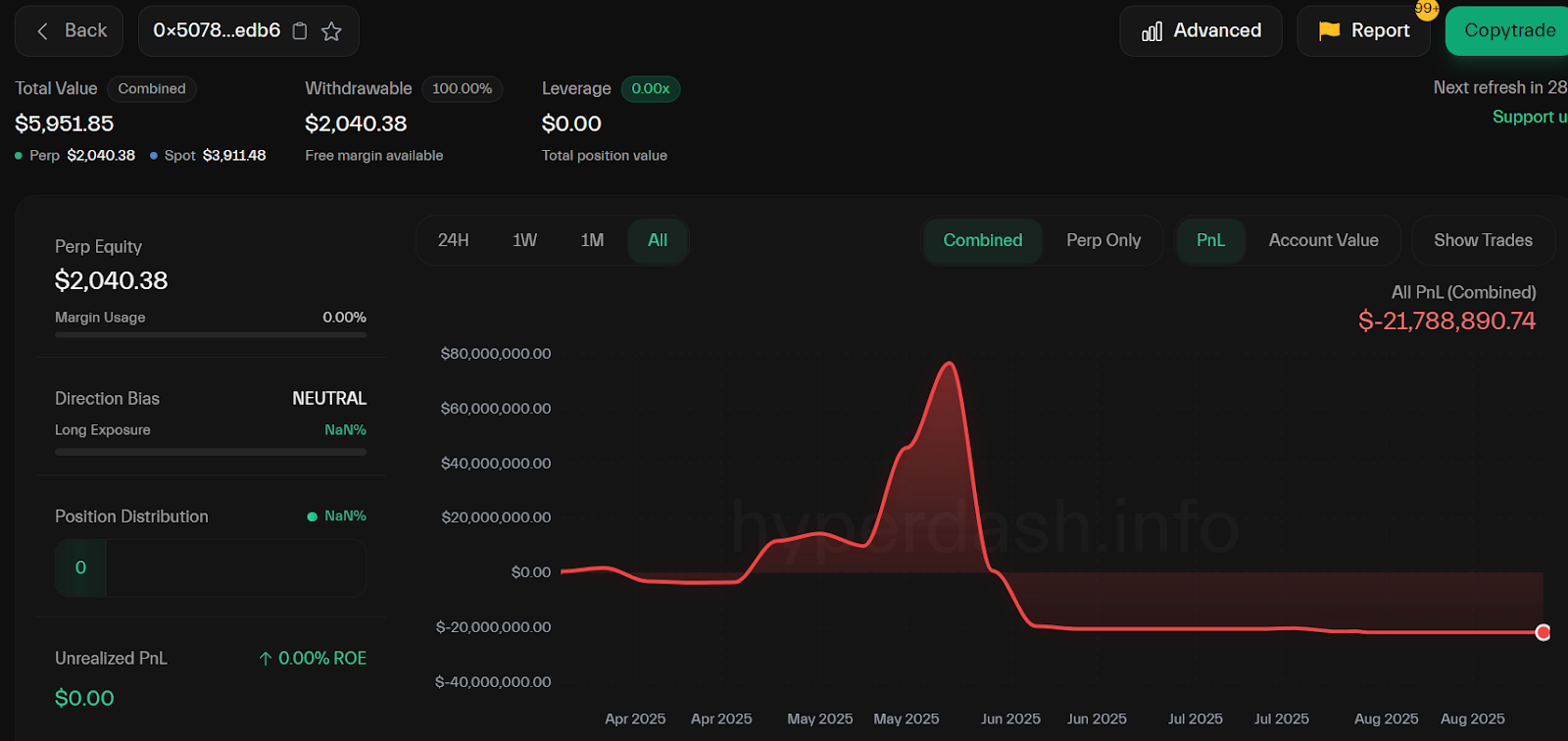 Still, Wynn has realized a $21.7 million total loss on a single account since March 19, when he started trading via wallet 0x5078 on the decentralized exchange Hyperliquid, data from Hyperdash shows.