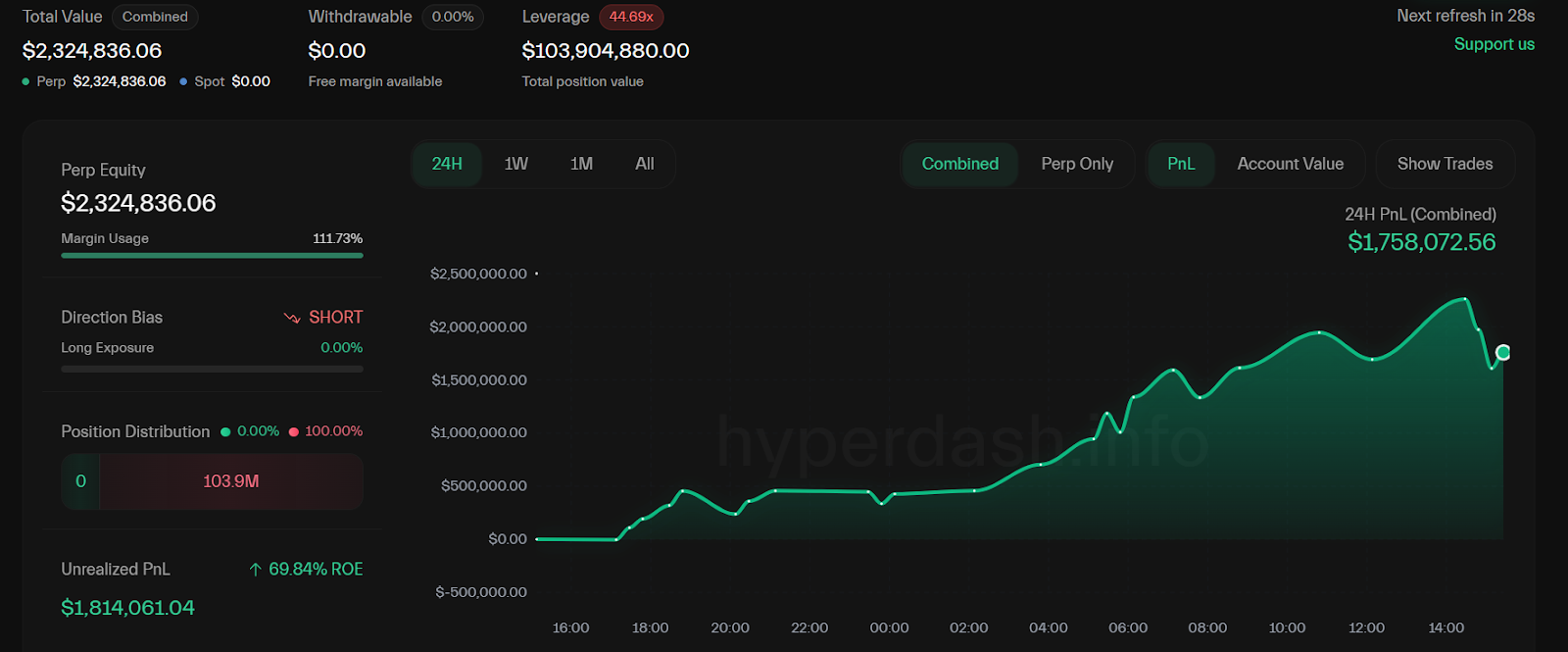 Still, not all traders are betting on Bitcoin’s upside. Popular trader Qwatio opened a 40x leveraged short position worth over $2.3 million, which effectively bets on Bitcoin’s price decline, according to Hyperdash data shared by blockchain analyst EmberCN.