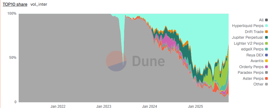 Hyperliquid’s perpetual futures market share has fallen sharply ahead of the unlocks. The platform accounted for just 33% of decentralized exchange (DEX) market share on Tuesday, down from 65% in mid-July, according to data from Dune.