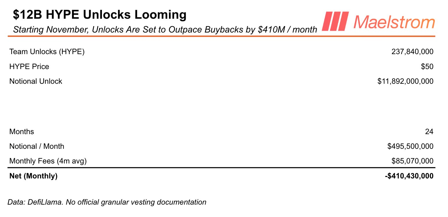 The vesting schedule will distribute $11.9 billion worth of HYPE tokens to team members, of which current buybacks would absorb only about 17% of that monthly supply, leaving $410 million in potential overhang, Maelstrom researcher Lukas Ruppert said.