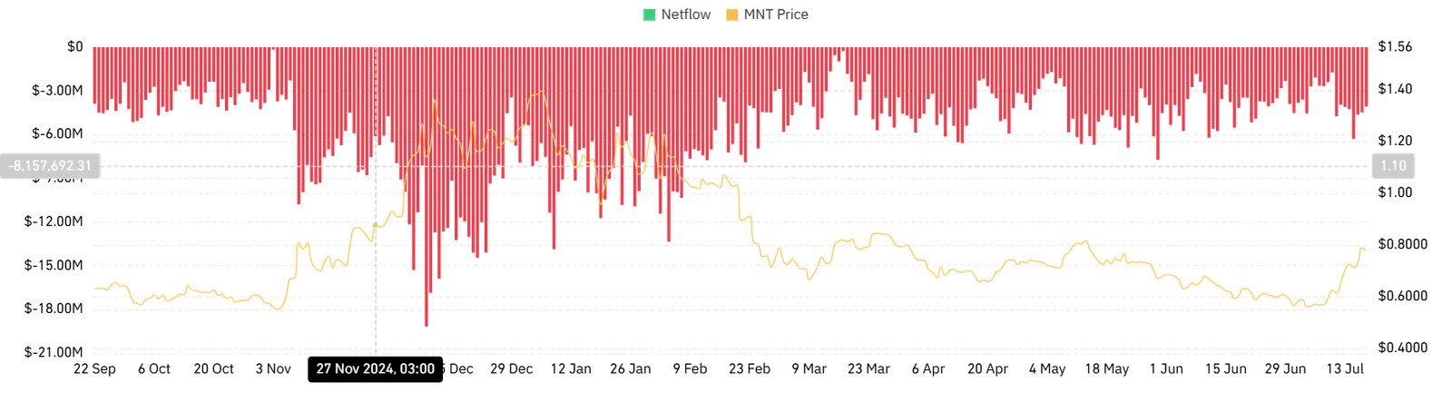 MNT has shown sustained buying activity, according to exchange flow data.