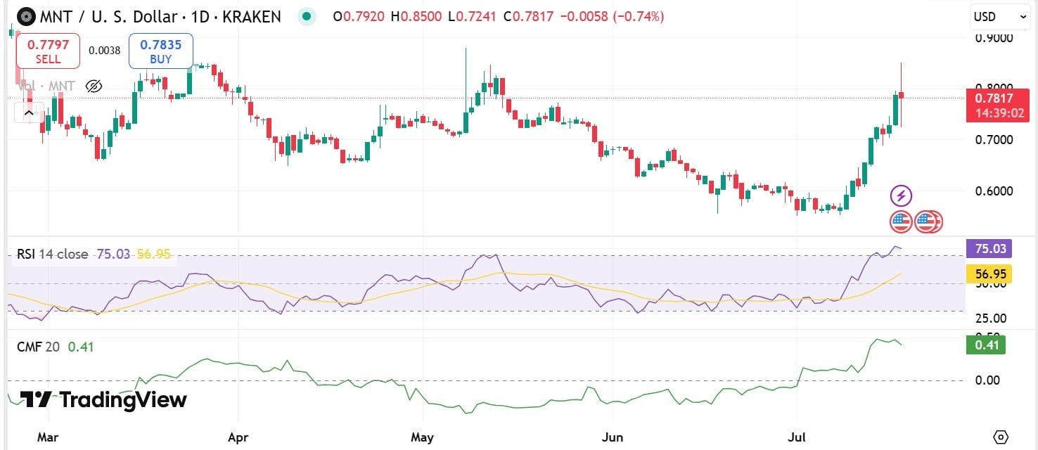 On daily charts, the altcoin surged from a low of $0.72 to a 2-month high of $0.85. After reaching these levels, MNT faced a solid rejection, leading to a retracement.