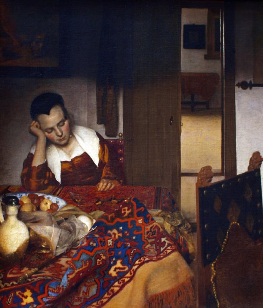 The Met’s team proposed the possibility of Vermeer’s painted-over self-portrait in 2023. If the theory is to be believed, the woman dozing at the table is not a maid, but the artist’s model. The idea is supported by her conspicuous adornments: pearl earrings and a sumptuous red dress, uncommon belongings for a servant.