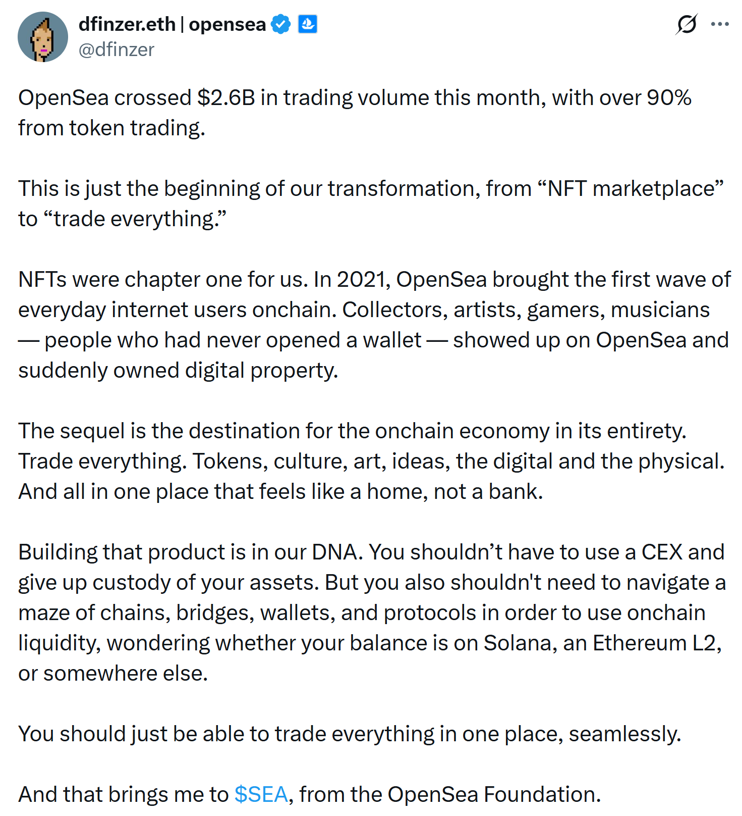 In a Friday post on X, Finzer announced that OpenSea’s October trading volume exceeded $2.6 billion, with over 90% of that amount coming from token trading, calling it the beginning of the platform’s transformation to “trade everything.”