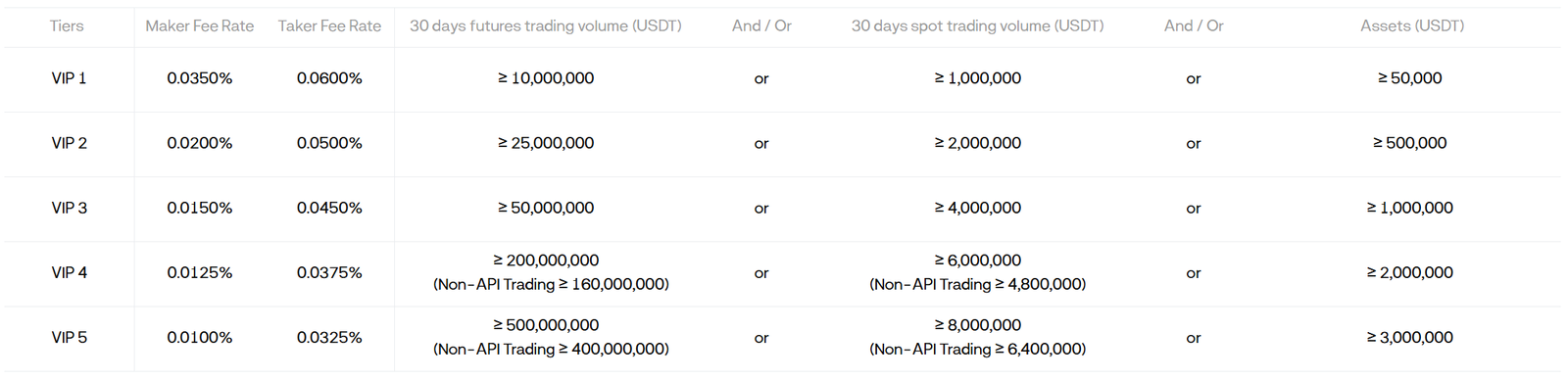 The BloFin fee structure offers different trading fees based on users’ VIP levels and provides numerous fee discounts. Below is a breakdown of these fees depending on VIP level.