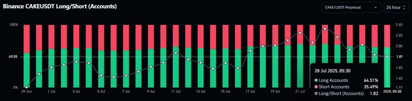 On Binance, the CAKEUSDT Long/Short Ratio stood at 1.82, with 64.51% of top accounts holding long positions and 35.49% short.