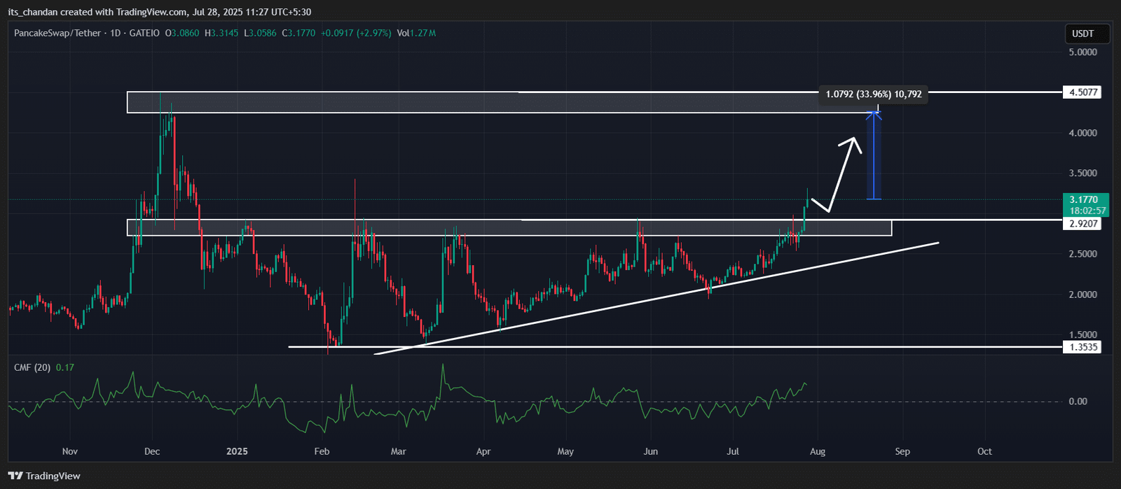 According to TradingView chart analysis, with the recent price uptick, CAKE has not only broken out the $2.90 level but also formed an ascending triangle pattern.