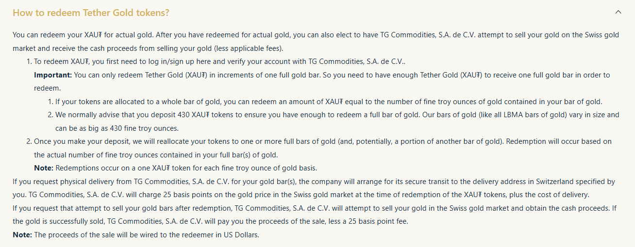 Tether’s XAUT tokens are currently redeemable for physical gold, but users need to have at least 430 XAUT to redeem for one full gold bar, according to Tether.