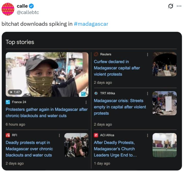 A Bitcoin open-source developer under the X handle callebtc, who is working on the messaging service, said on Sunday, “Bitchat downloads spiking in Madagascar,” along with screenshots of the protest’s news coverage.