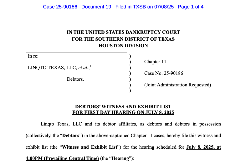 Linqto’s first bankruptcy hearing is scheduled for Tuesday at 9:00 pm UTC, with witnesses including chief restructuring officer Jeffrey Stein, Kate Mailloux from Epiq Corporate Restructuring and Ryan Hamilton, senior vice president for debt advisory and restructuring at Jefferies.