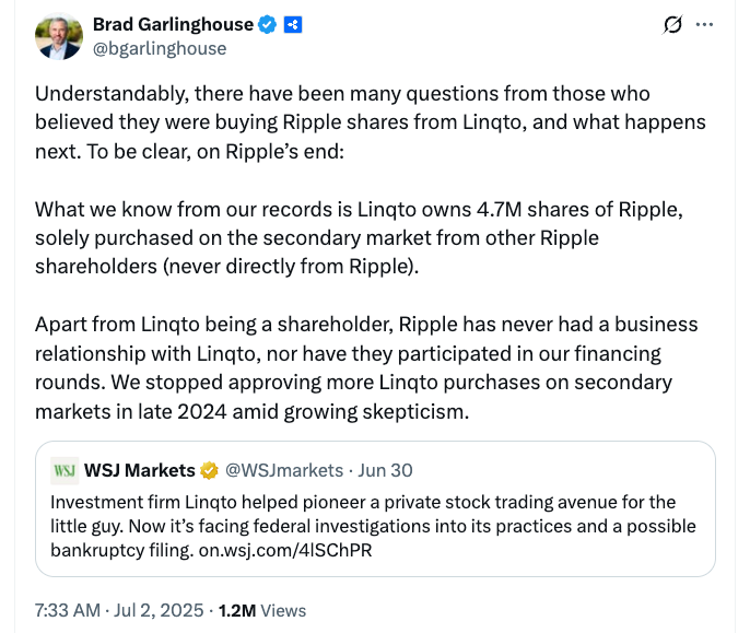 “Apart from Linqto being a shareholder, Ripple has never had a business relationship with Linqto, nor have they participated in our financing rounds,” Garlinghouse said in an X post.