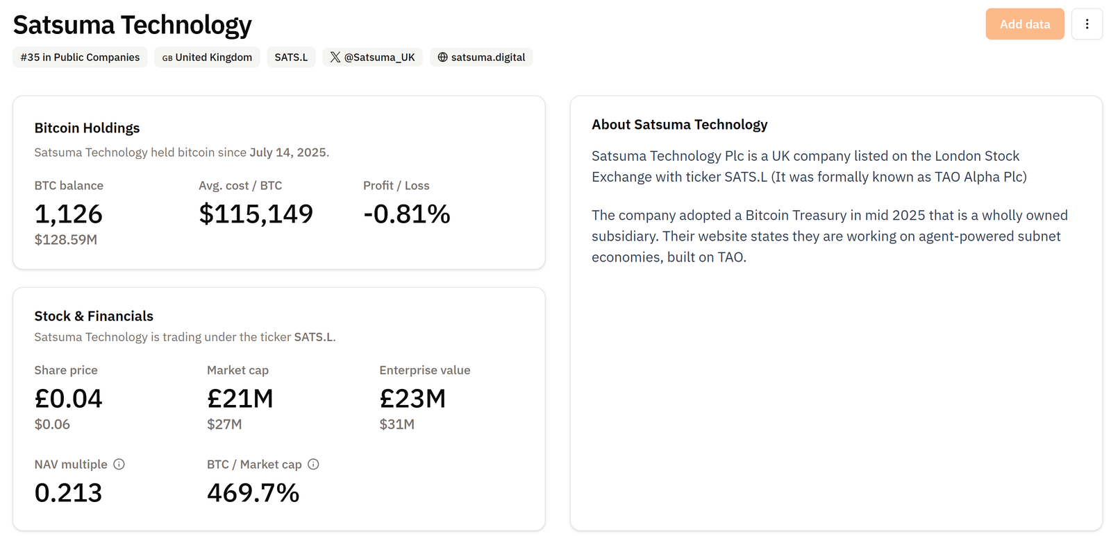 Satsuma holds 1,126 BTC valued at about $128.66 million, having acquired the asset since July 14. The company’s average cost per Bitcoin stands at $115,149, placing its current position at a slight unrealized loss of 0.76%, according to BitcoinTreasuries.NET data.