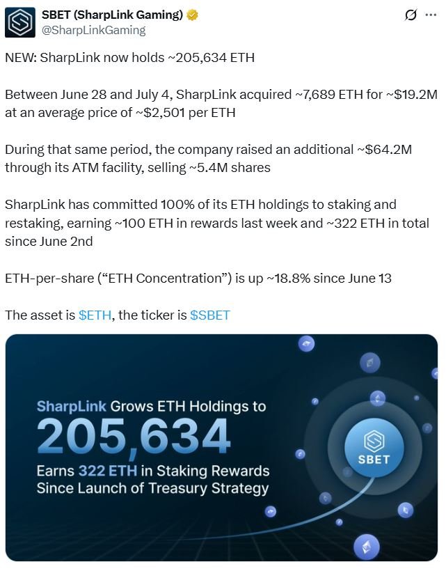SharpLink said on Tuesday that in a buying spree from June 28 to July 4, it acquired 7,689 Ether (ETH) for over $19 million at an average price of $2,501, adding to its growing treasury.