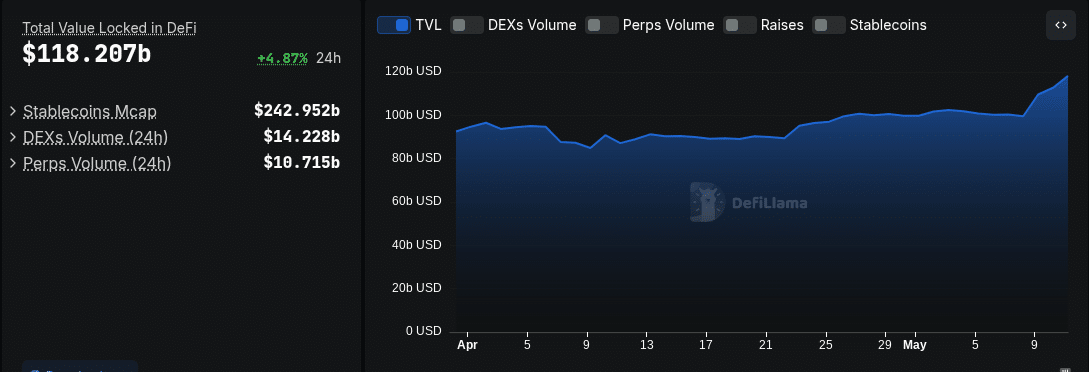 According to DeFiLlama, TVL soared past $118 billion, a nearly 5% jump in 24 hours, marking one of the strongest single-day gains in recent weeks.