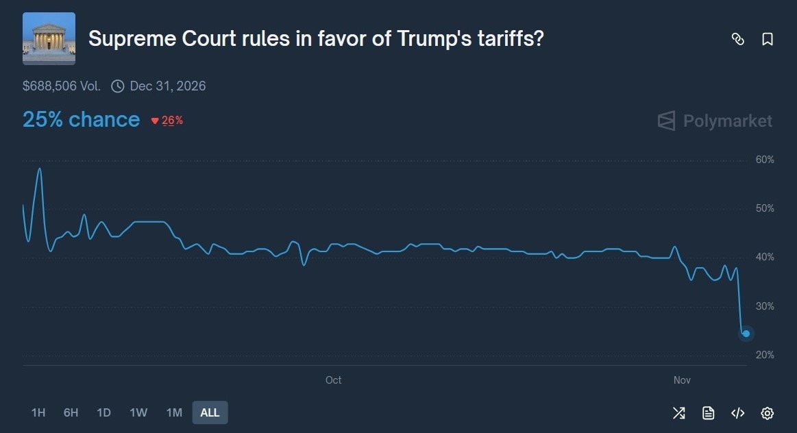 Prediction markets are signaling declining confidence that the US Supreme Court will rule in favor of President Donald Trump’s sweeping tariff powers, with traders on regulated and crypto-native platforms reducing their exposure following the week’s developments.