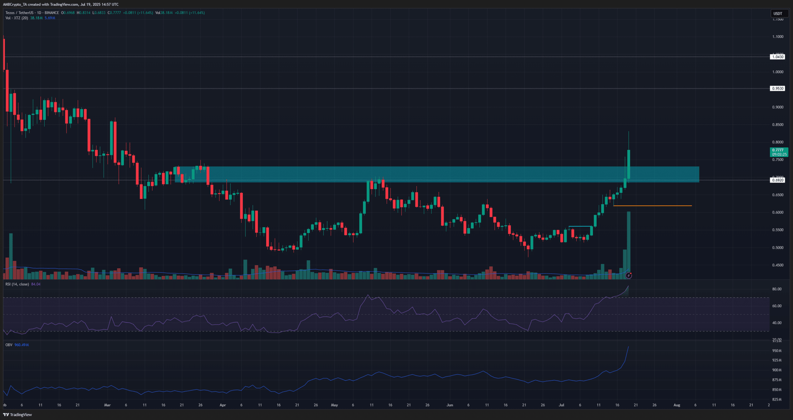 It also managed to climb past the $0.7 resistance zone. Highlighted by the cyan box, this supply zone stretched back to March. Tezos bulls failed to break past this area upon the May retest.