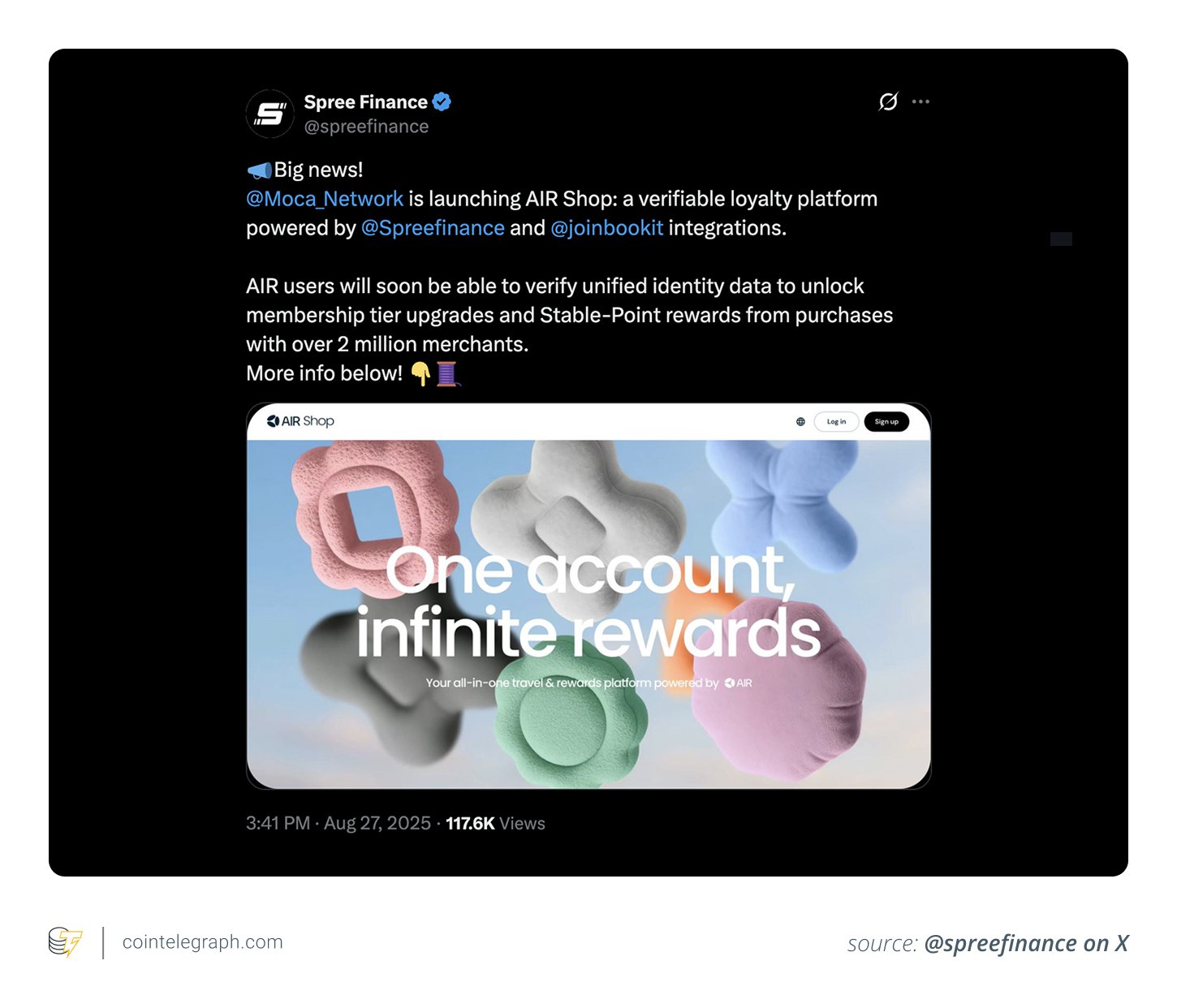 Air Shop, scheduled for launch in September 2025, seeks to reshape loyalty programs through stablecoin-powered commerce. The platform employs Air Kit for secure identity and tiered membership verification, offering tailored rewards. At its core are Stable-Points (AIR SP), USD-backed tokens linked to stablecoins, which maintain their value unlike traditional loyalty points. These Stable-Points can be used at over 2 million merchants via BookIt.com, spanning travel, retail, dining and luxury experiences.
