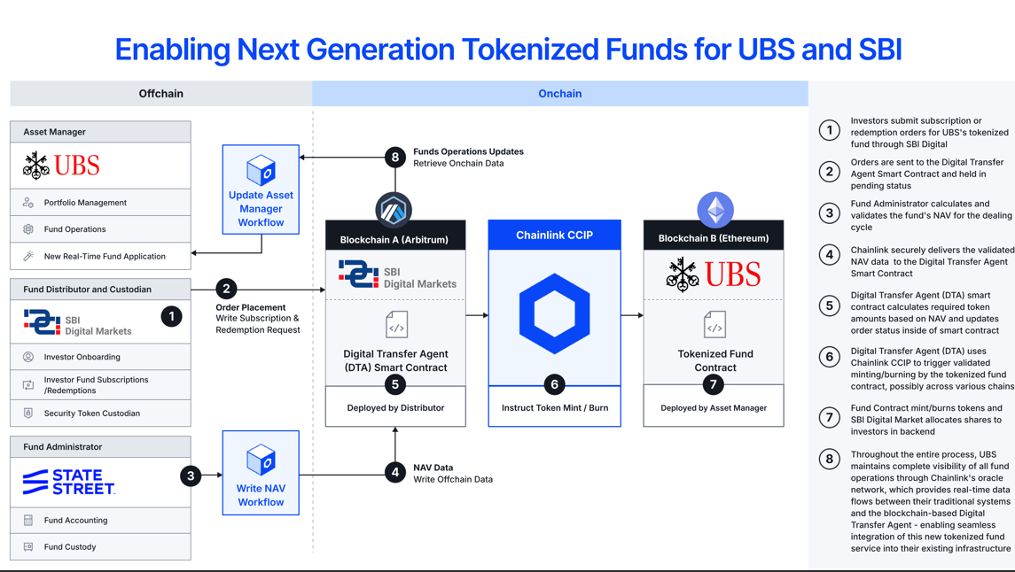 Another example (see below) involved moving tokenized Hong Kong dollars from a private chain to a public chain and into a tokenized fund. TradFi giant UBS was the asset manager in this case, SBI Digital Markets was the fund distributor and custodian, and funds were moved via Chainlink’s oracle network from the Arbitrum blockchain to the Ethereum blockchain.