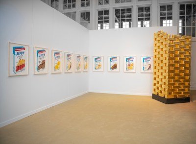 In his booth at Independent, Zadikian’s column of gilded plaster bricks, Made in USA, echoes Brancusi’s Infinite Column and nods to the first work he showed with Shafrazi back in the ’70s. Alongside Zadikian’s work, Shafrazi is presenting a multi-panel set of canvases painted to resemble Jiffy baking-mix boxes by Brandon Deener.