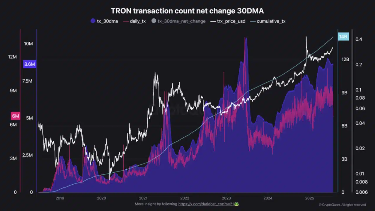 Tron has now processed over 14 billion transactions, with daily activity averaging 8 to 9 million — nearly double the pace seen during the last bear market.