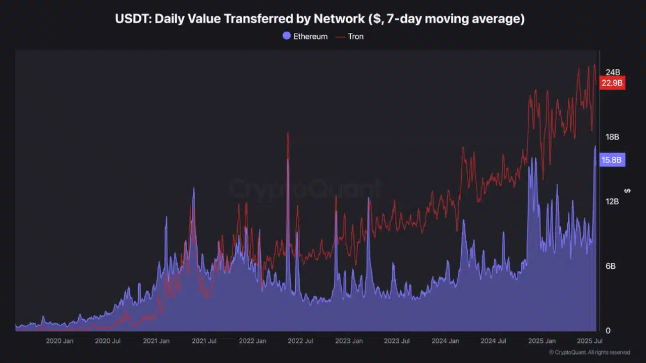 Complementing this is the dominant surge in stablecoin usage: the network also facilitates over $20 billion in USDT transfers daily, far surpassing Ethereum’s $16 billion.