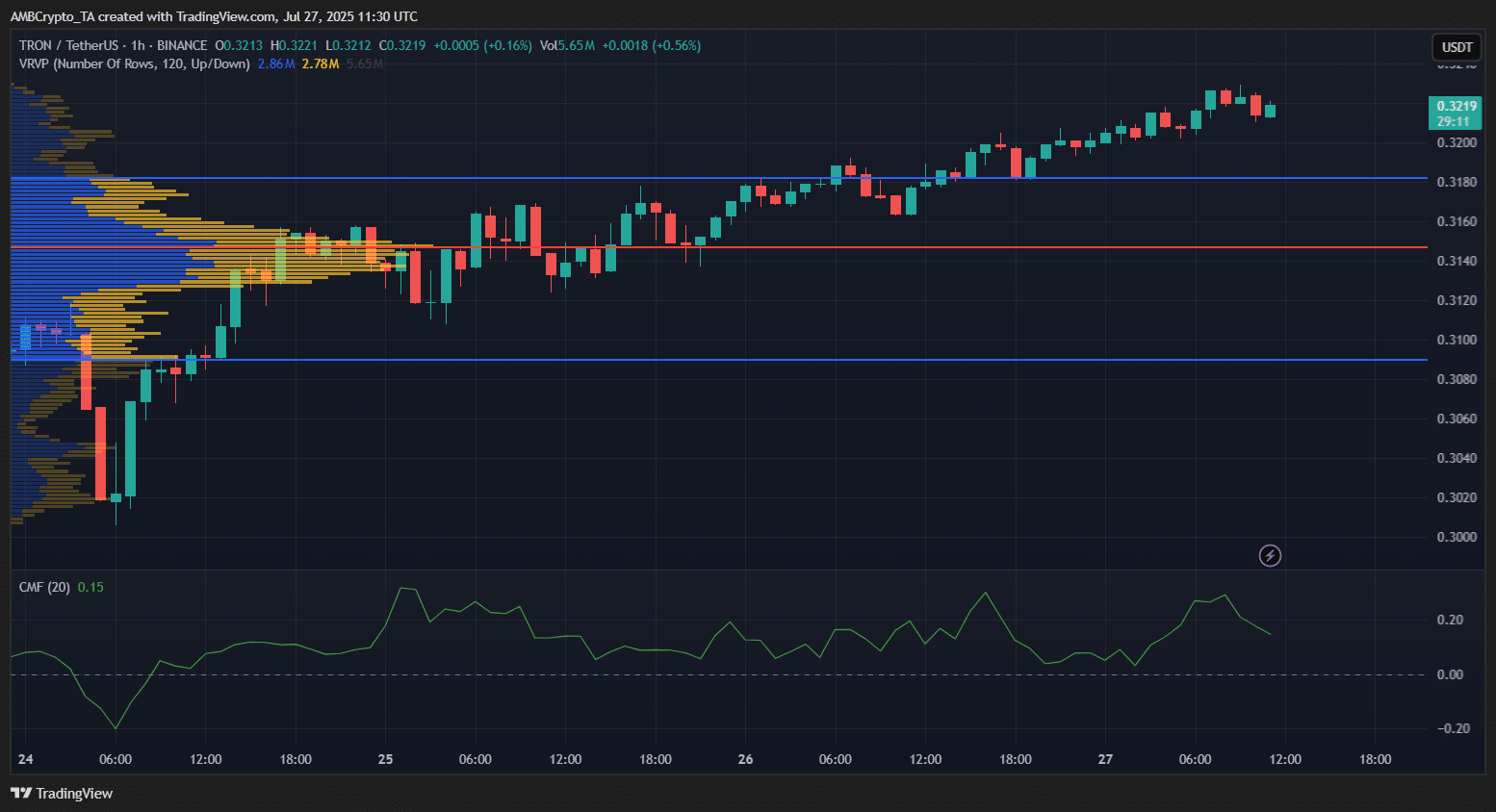 The volume profile indicated strong accumulation between $0.316 and $0.318 at press time, while CMF staying in positive territory showed sustained buying pressure.