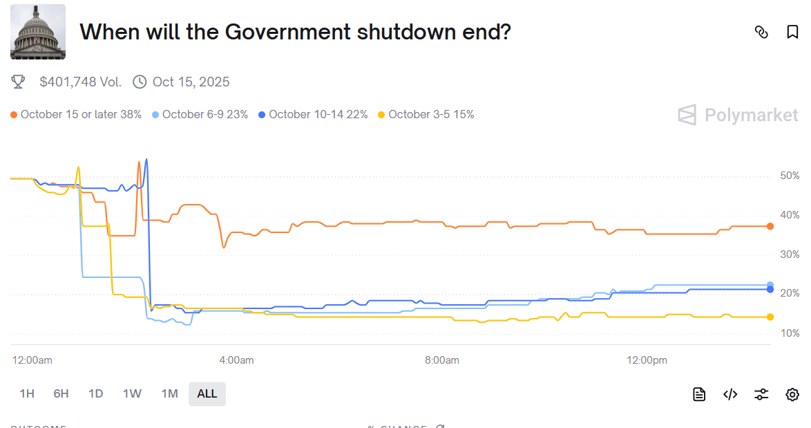 On prediction market platform Polymarket, traders see a 38% chance the shutdown will end by Oct. 15.