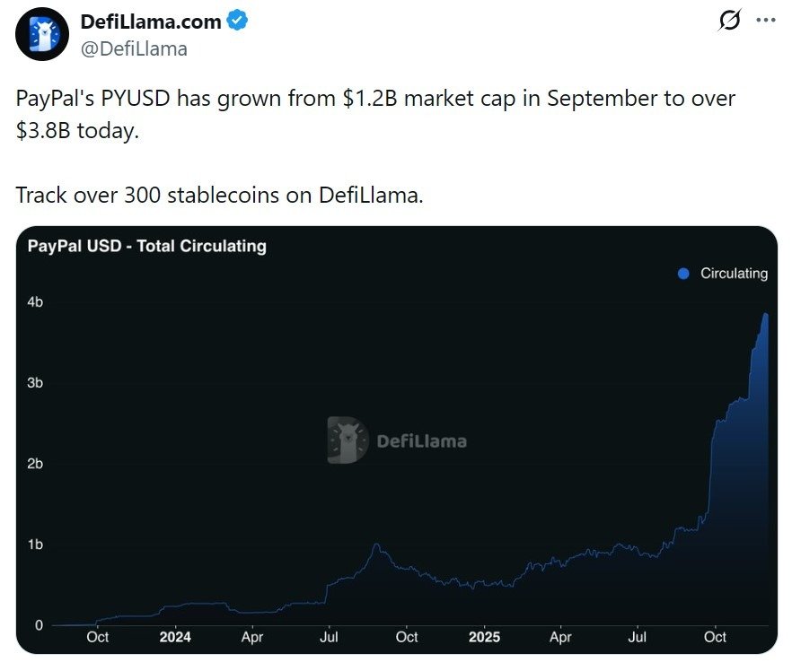 PayPal USD (PYUSD) posted the strongest growth among the major dollar-pegged stablecoins, jumping from $2.8 billion to $3.8 billion in November. This marks 1 billion inflow for the month, a 35% month-on-month growth.