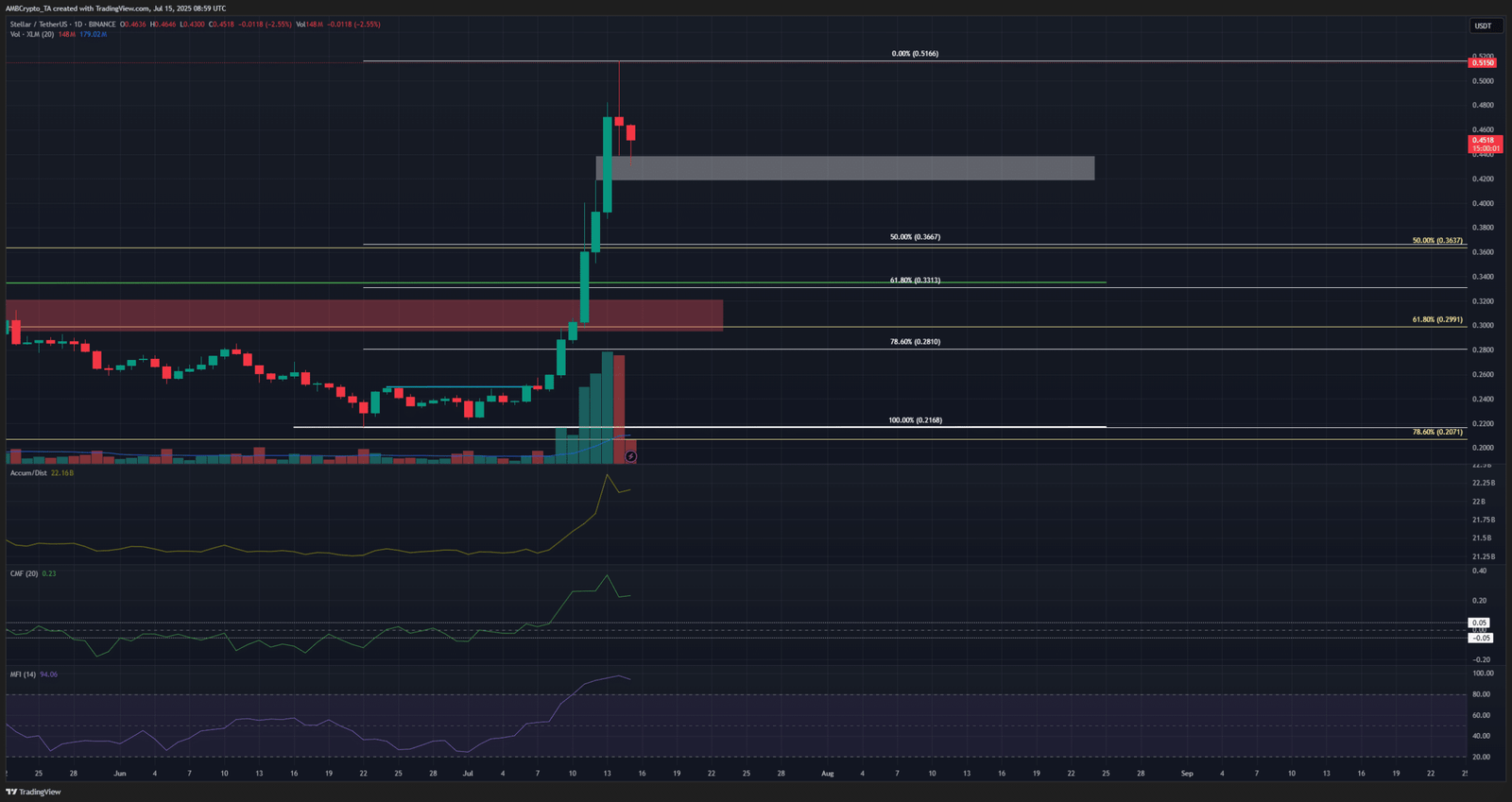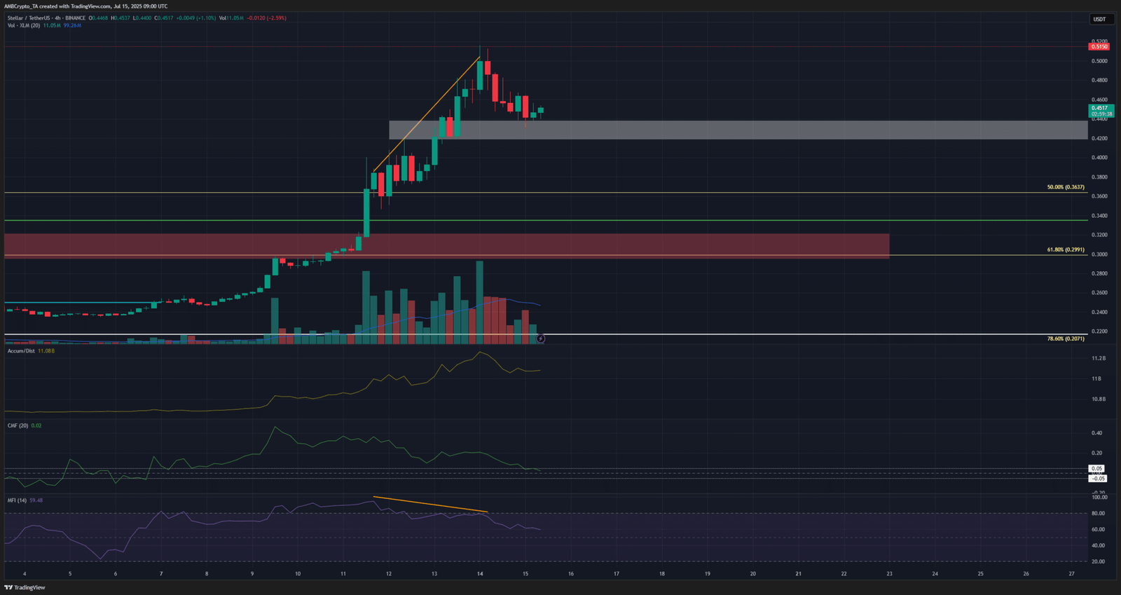XLM has a strongly bullish outlook across multiple timeframes and has revisited the $0.42-$0.44 demand zone. The pullback might be over, unless Bitcoin drops below the $116.8k short-term support.