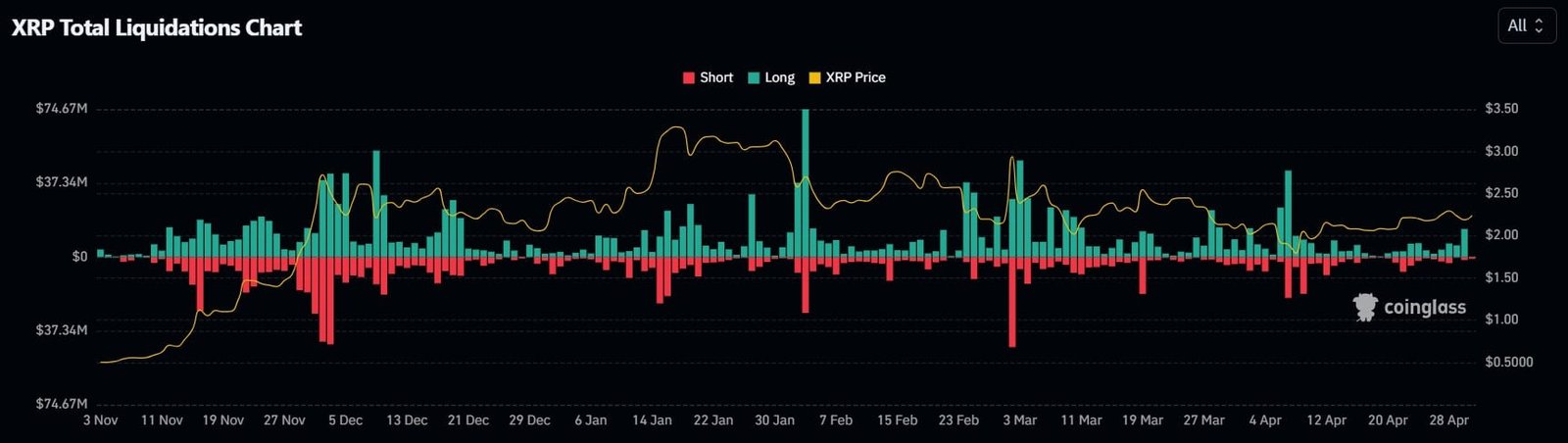 On the 30th of April, XRP saw a staggering $13.9 million in long liquidations versus just $1.49 million in shorts, according to CoinGlass — an eye-watering 1000% imbalance.