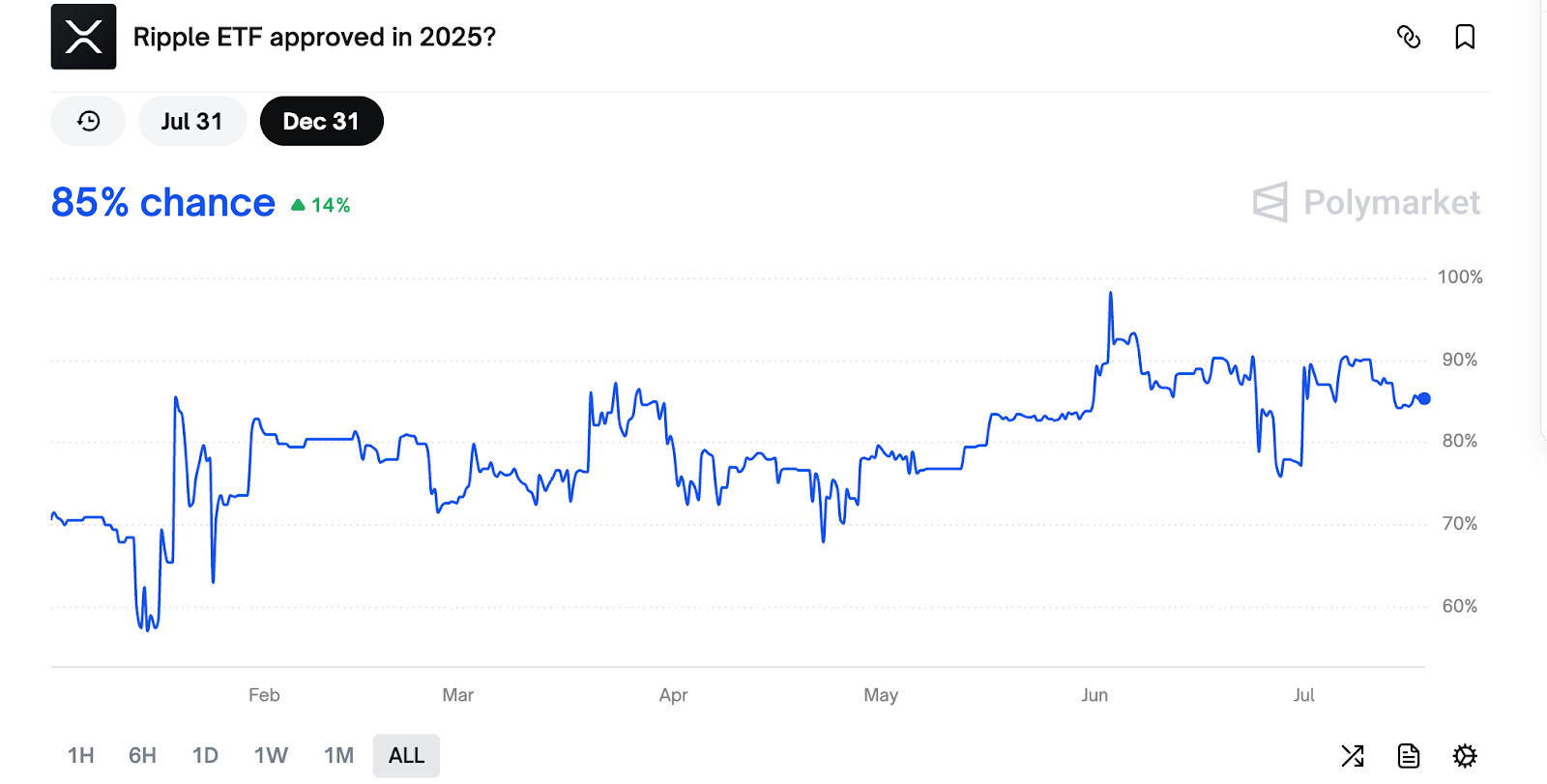 The odds of the US Securities and Exchange Commission approving a spot XRP ETF in 2025 were at 85% as of Friday, according to Polymarket data.