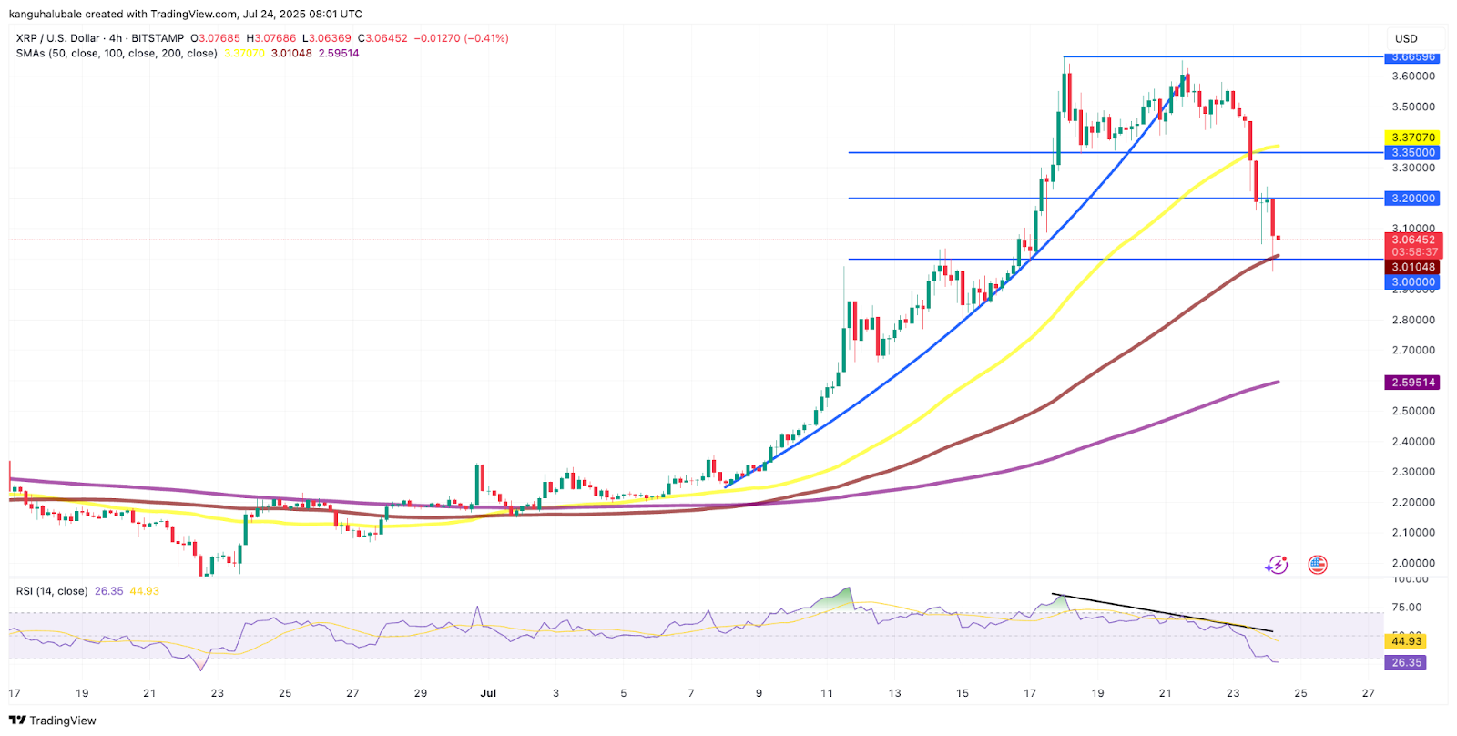The $3 level, which is also the 100-period simple moving average (SMA), now holds as support, and if bulls are unable to defend it, XRP could extend the decline to retest the 200-period SMA at $2.60.